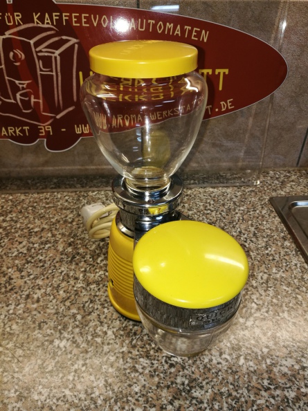 Quickmill Retro Espressomühle gelb; Scheibenmahlwerk, Glasbehälter, Original Zustand, funktionsfähig, in Original Verpackung !! Preis: 200.- Euro